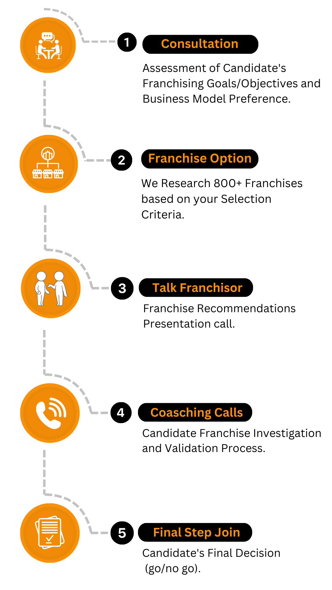 After thoroughly analyzing and researching the best options for you, we will craft a personalized business model and introduce you to franchise opportunities that align perfectly with your goals from our carefully curated portfolio of vetted franchises.